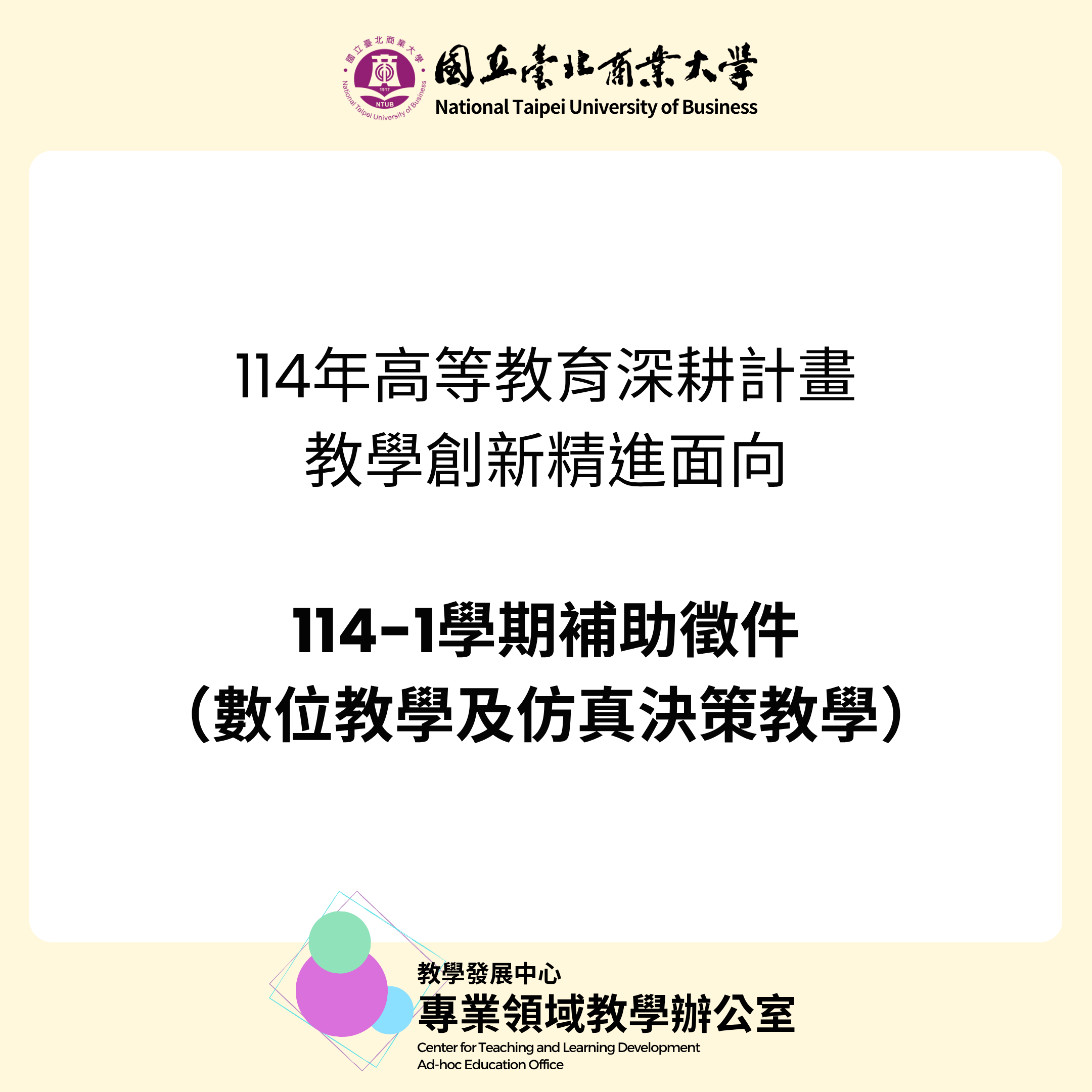 【教學辦公室】114年高等教育深耕計畫教學創新精進面向-114-1學期補助徵件(數位教學及仿真決策教學)