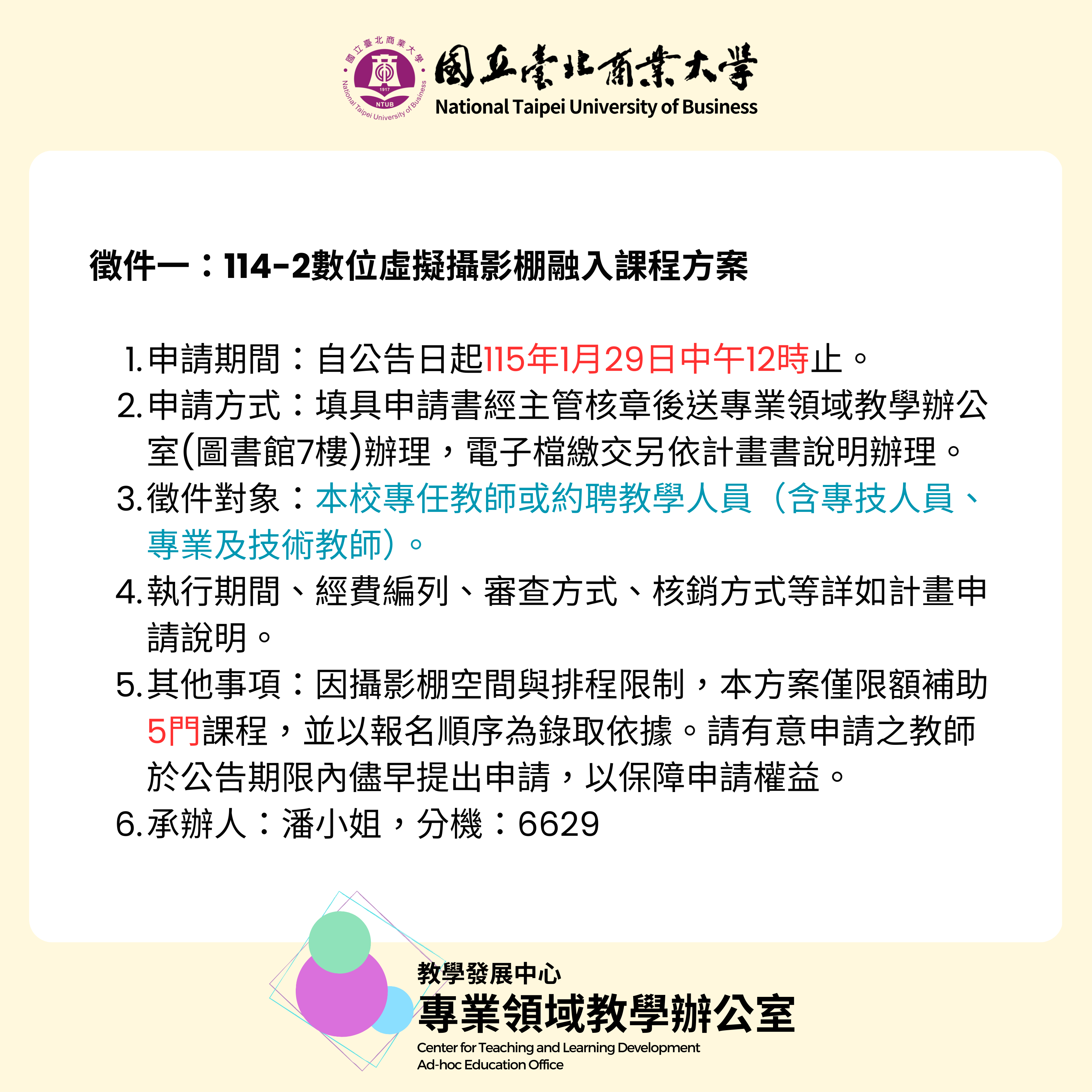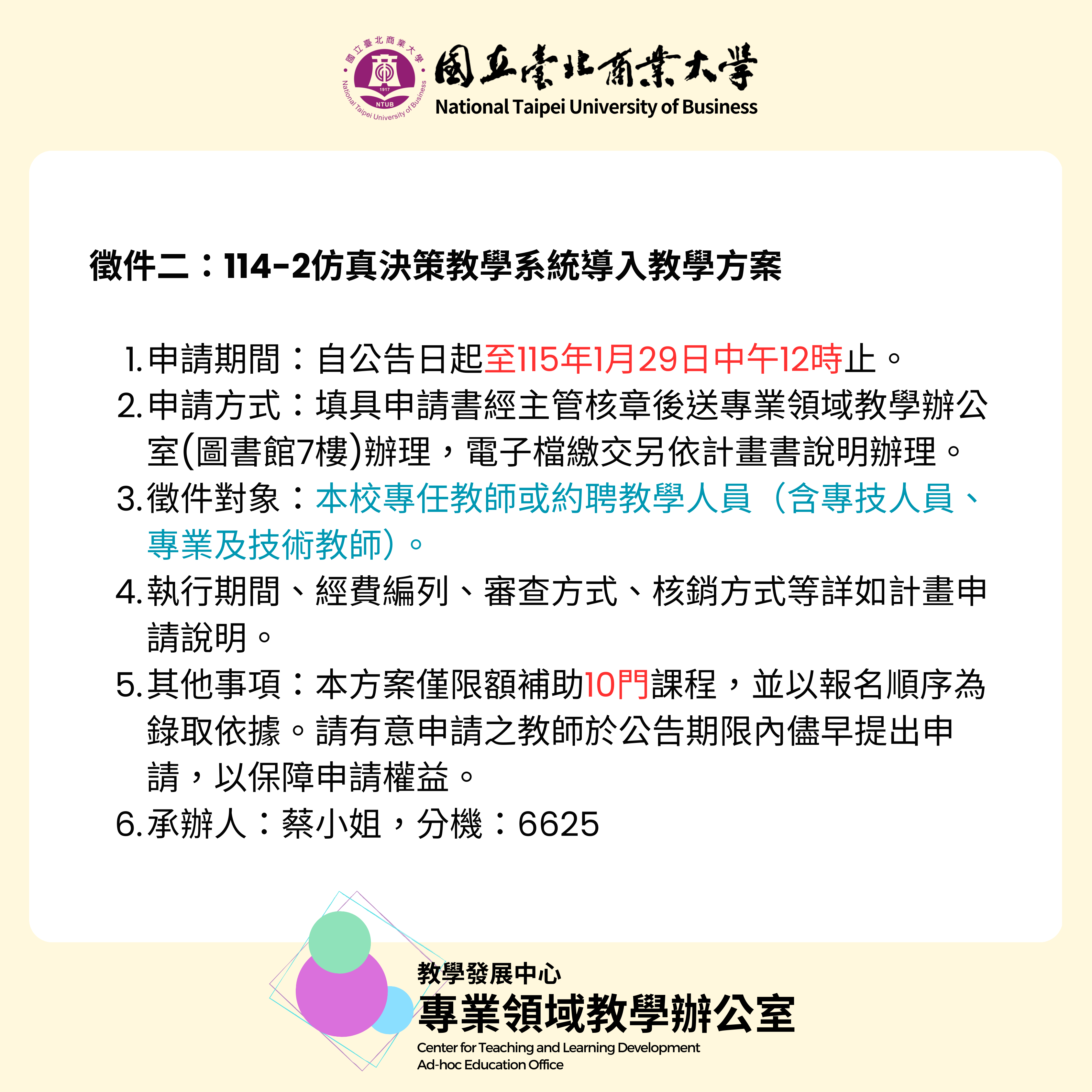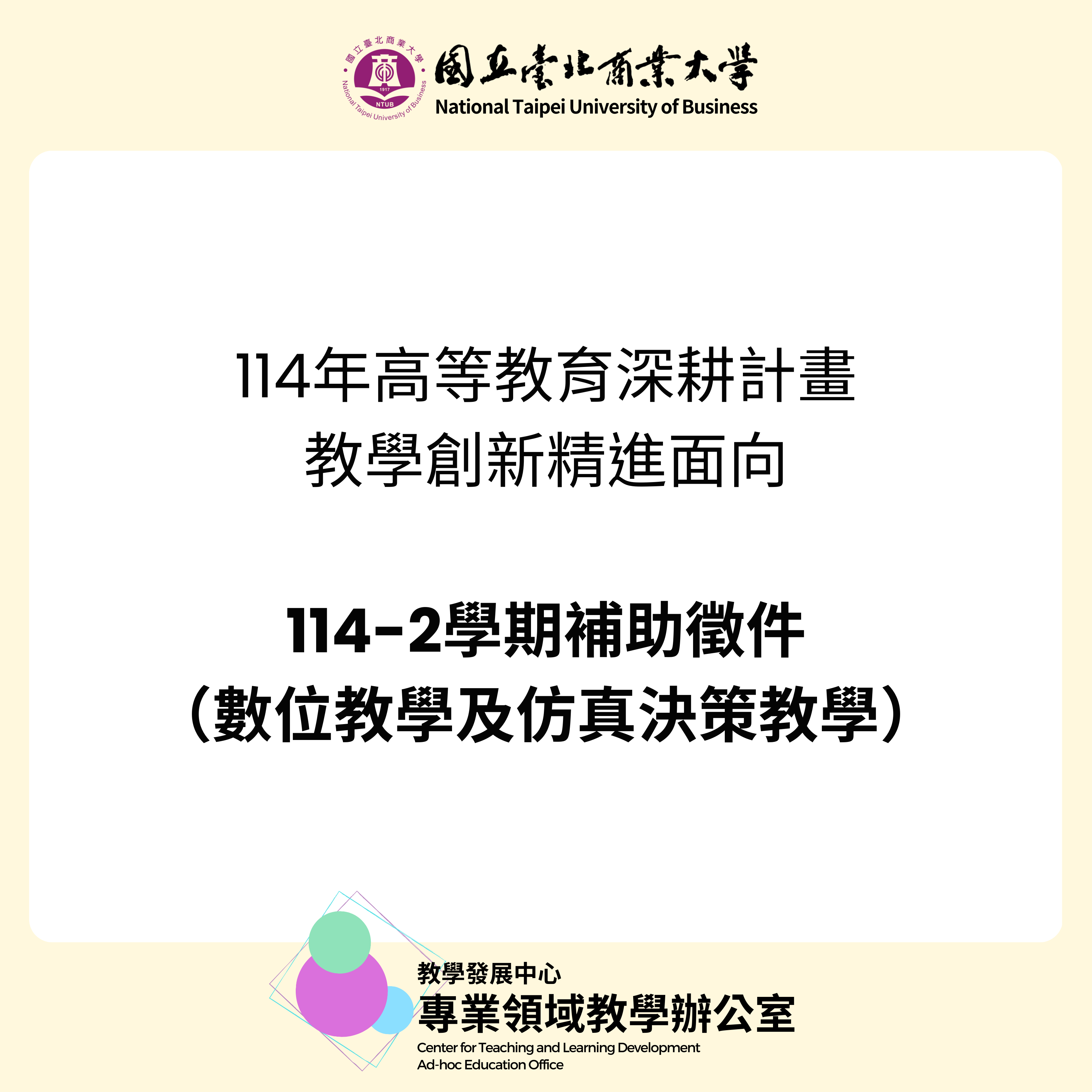 【教學辦公室】115年高等教育深耕計畫教學創新精進面向-114-2學期補助徵件(數位教學及仿真決策教學)