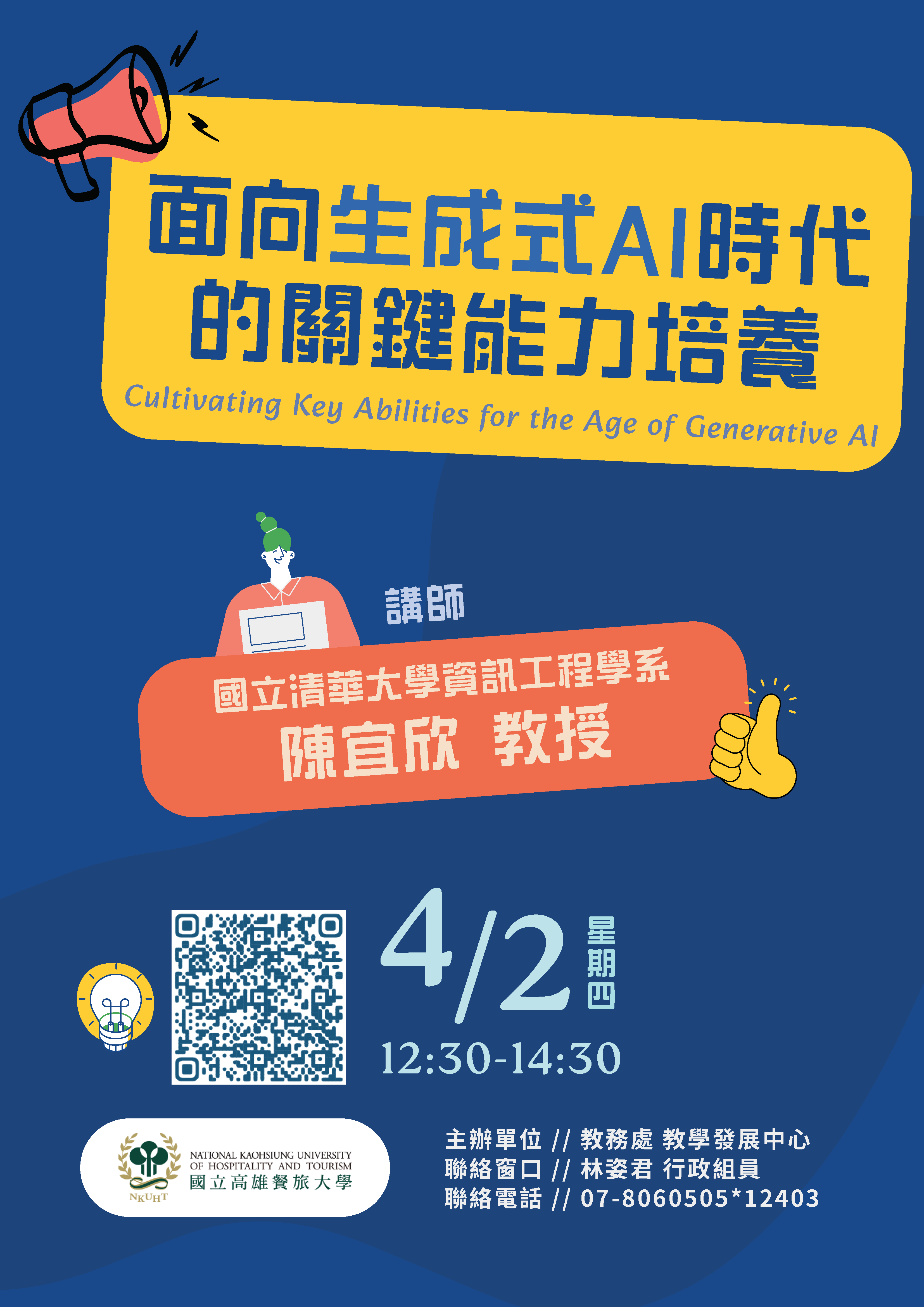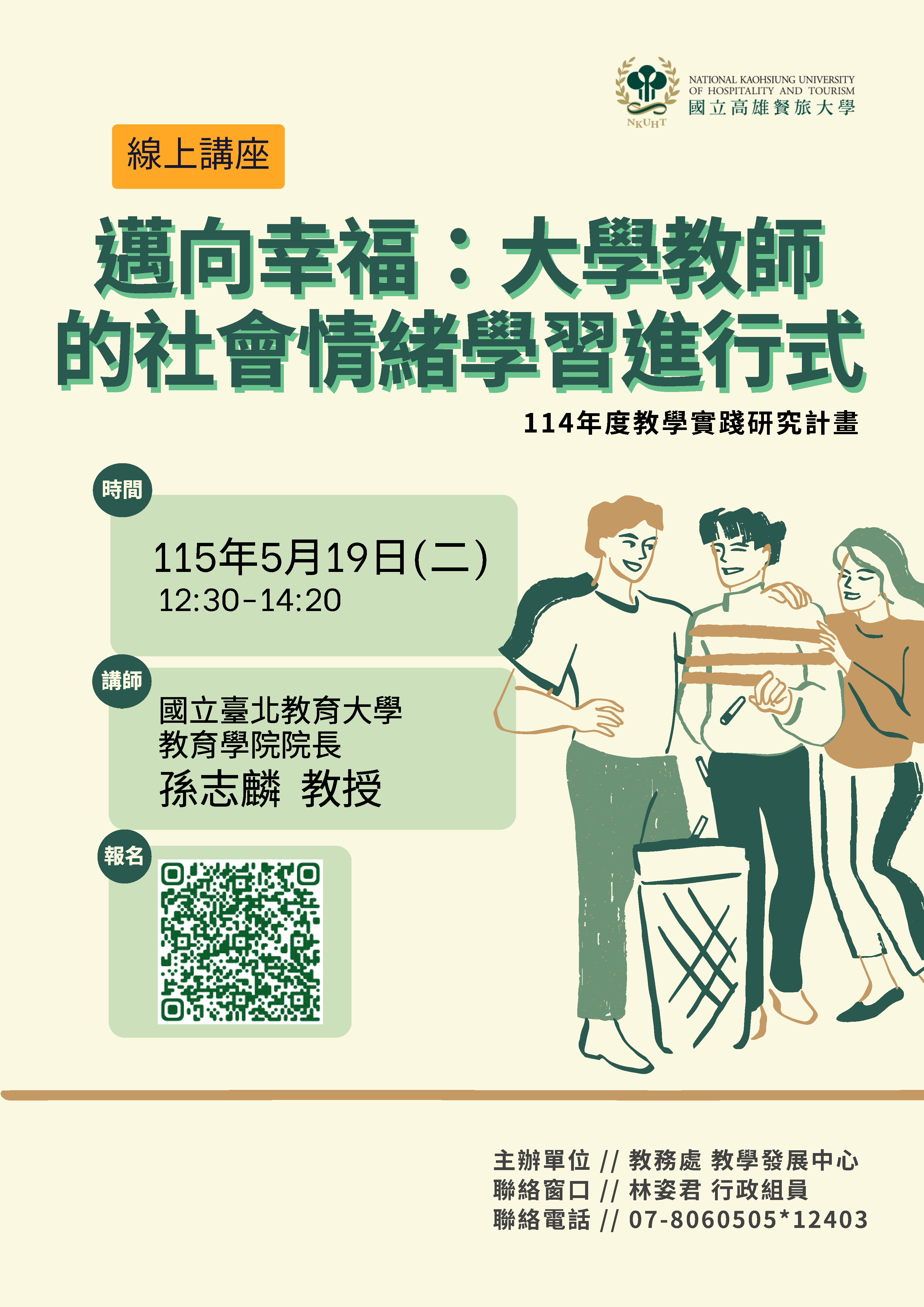 國立高雄餐旅大學辦理「114-2教師增能系列講座」研習課程,即日起開放線上報名