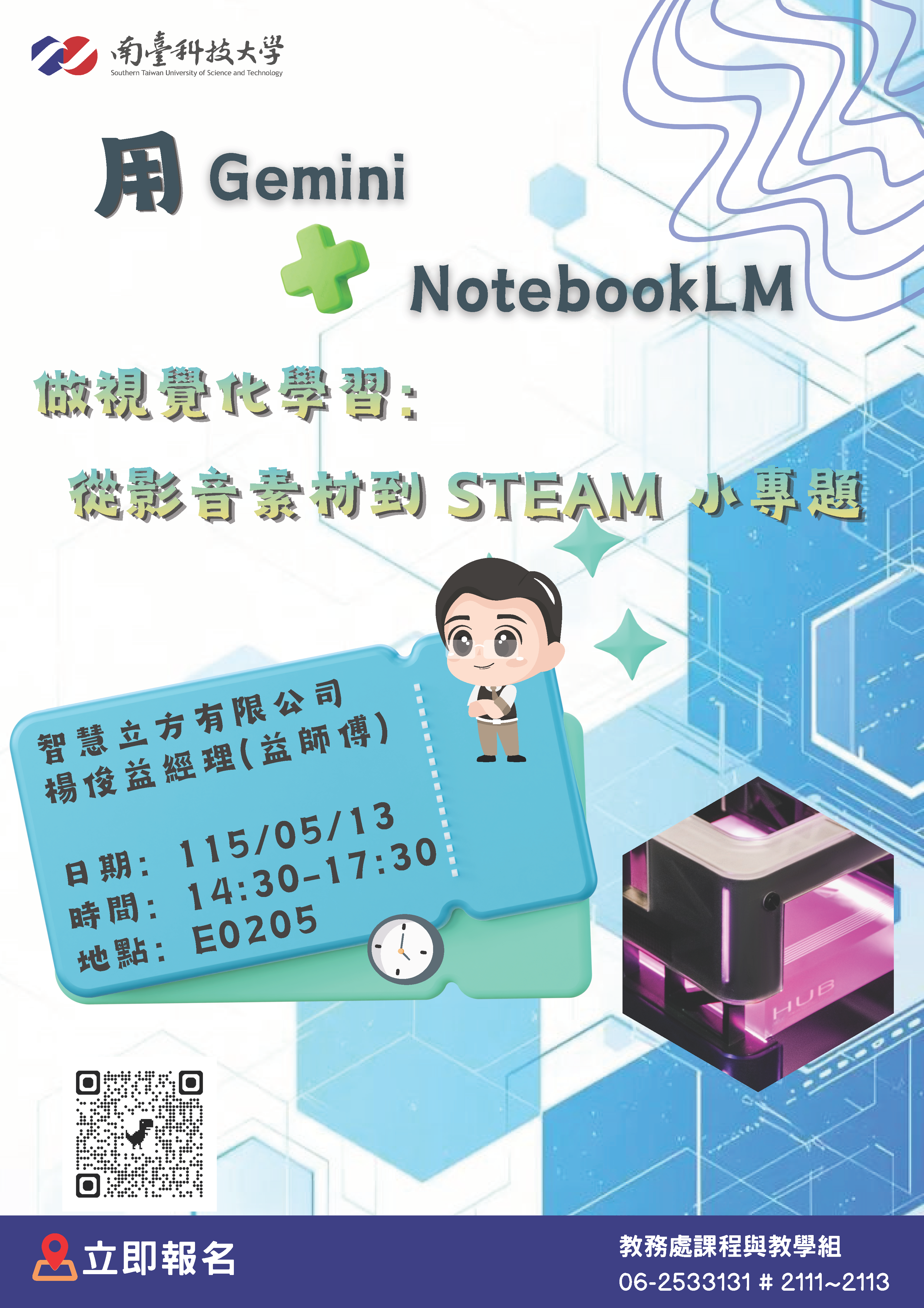 南臺科技大學辦理「用Gemini+NotebookLM做視覺化學習:從影音素材到STEAM小專題」專題講座,鼓勵教師踴躍參加。相關資訊如下: