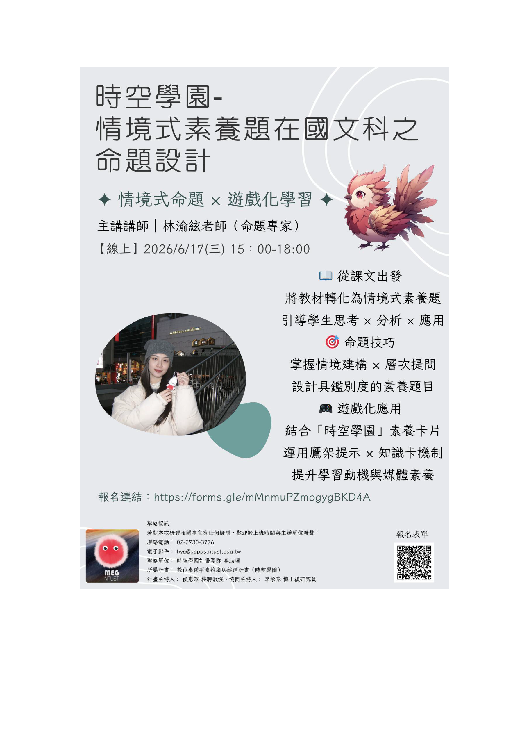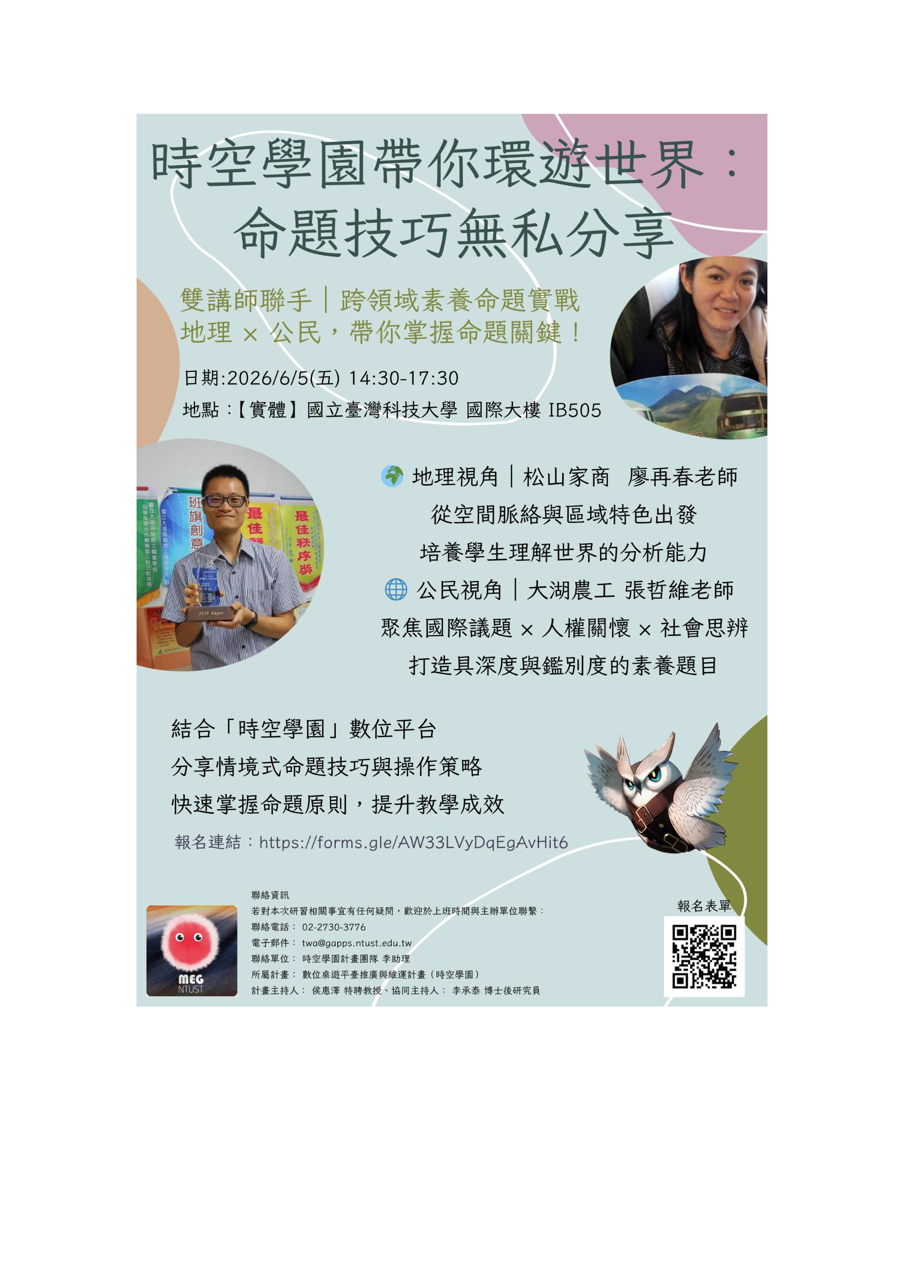一、國立臺灣科技大學應用科技所訂於本(115)年6月5日14時30分至17時30分,舉辦「教育部因材網-時空學園帶你環遊世界:命題技巧無私分享」及本(115)年6月17日15時00分至18時00分「情境式素養題在國文科之命題設計」研習。